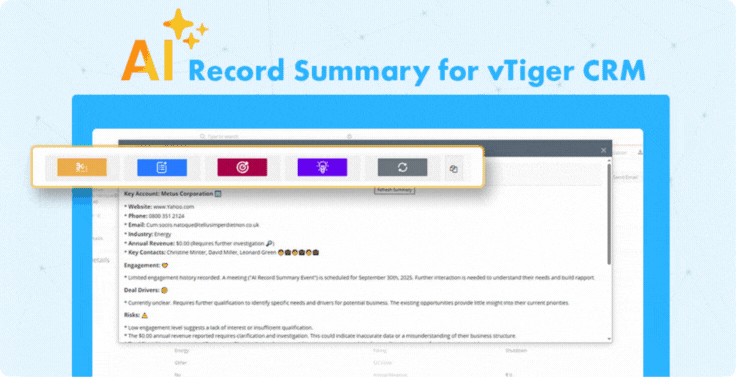It’s a vTiger CRM extension by CRMTiger, powered by Gemini AI, that generates intelligent summaries for records across any enabled CRM module. It helps you quickly understand key details, engagement history, opportunities, and risks without manually reviewing lengthy record data.