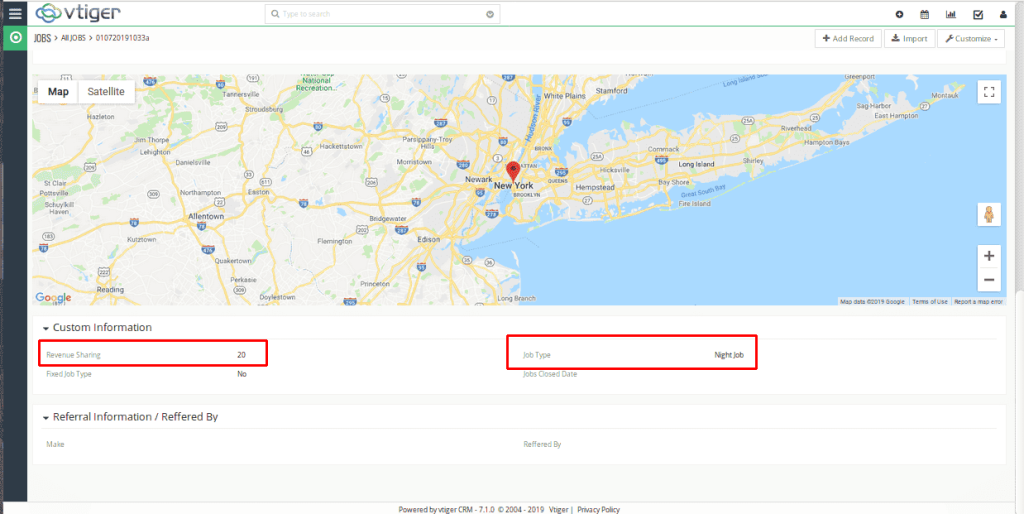 - When a job is added by a user, vTiger will find a technician based on a matching zip code and send a text message with a link to accept or decline the job offer.